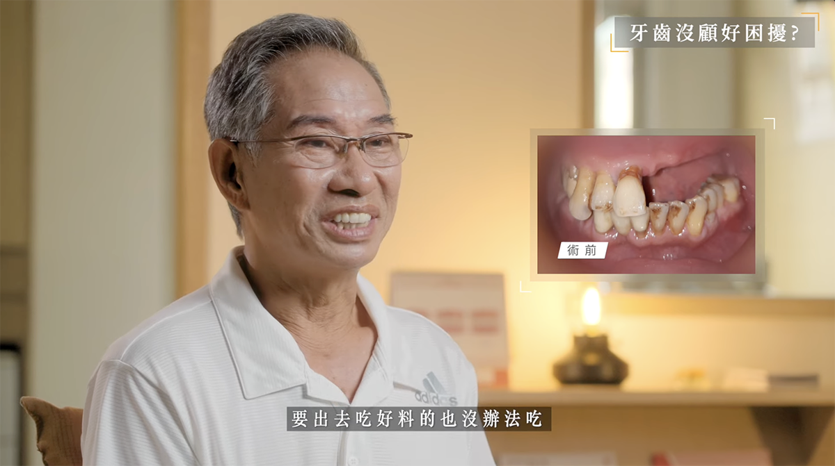 更讓他備受打擊的,是缺牙導致的臉型改變。因為沒有牙齒支撐,嘴唇嚴重凹陷,他回憶道:「那時候連開口跟別人講話都不敢,我老婆甚至說,我看起就像八、九十歲的老人家一樣!」