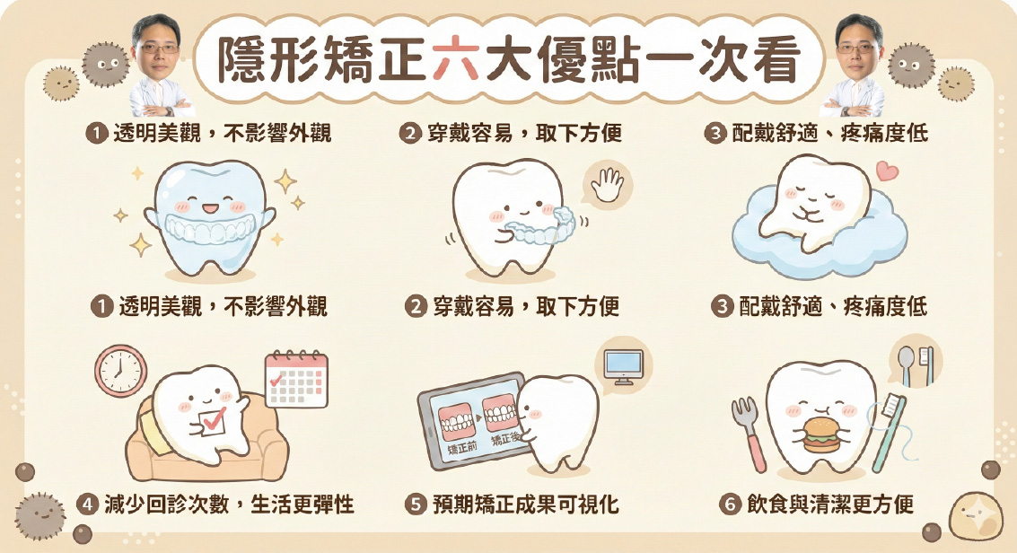 相比傳統矯正,隱形矯正(如 Invisalign 隱適美)運用了高科技透明材質,讓矯正過程融入您的日常生活,幾乎感覺不到它的存在。
